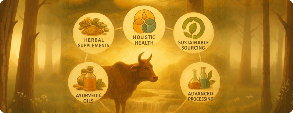 Utilizing traditional Ayurvedic herbs like Ashwagandha, Triphala, Shatavari, Turmeric, which have been known for their healing properties, to enhance immunity, digestion, and overall well-being of animals. The herbs can be processed into powders, oil, or extracts, ensuring that they retain their medicinal value while being easy to incorporate into modern feed